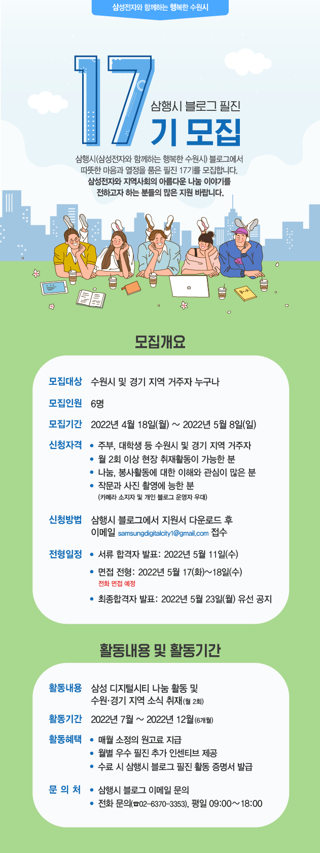 삼행시(삼성전자와 함께하는 행복한 수원시) 블로그에서 따뜻한 마음과 열정을 품은 필진 17기를 모집합니다. 삼성전자와 지역사회의 아름다운 나눔 이야기를 전하고자 하는 분들의 많은 지원 바랍니다.