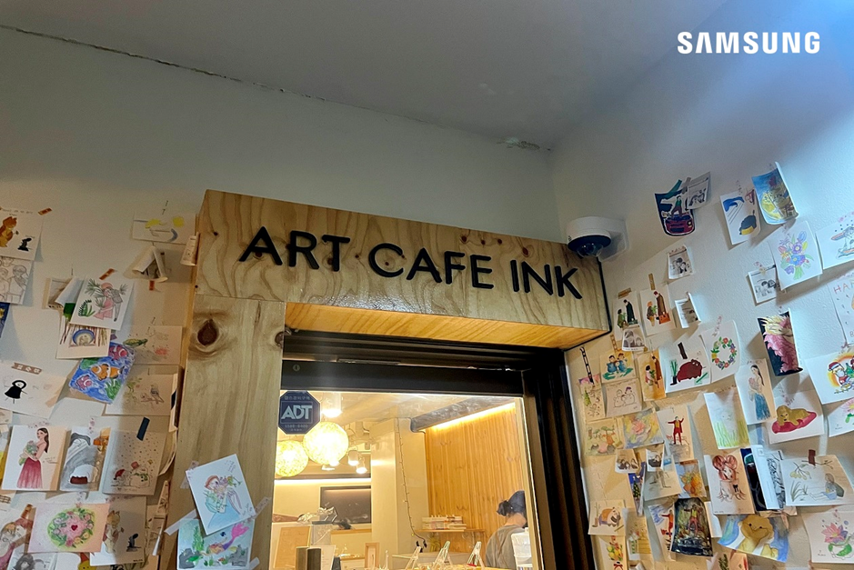 여기서 잠깐! 매장 입구에는 사진에서 보이는 곳처럼 프라이빗한 공간도 꾸며져 있는데요. 이 공간은 <Art cafe ink>를 방문한 수많은 사람들의 작품이 전시되어 있는 포토존입니다.