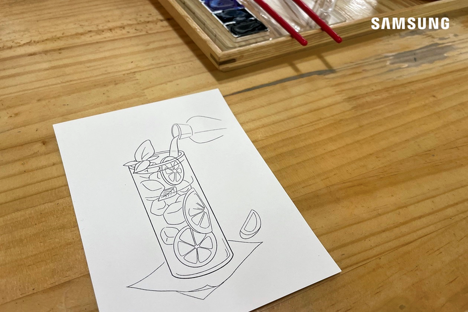 자, 이제 수원 이색 카페 <Art cafe ink>의 명물 엽서를 칠해볼 차례입니다. 엽서와 함께 가져왔던 수채화 물감 외에도 테이블마다 색연필과 같은 채색 도구가 마련되어 있어서, 다양한 도구를 활용하여 엽서를 완성할 수 있습니다.