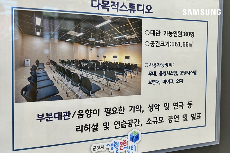 그중 슬기관의 생활문화센터를 방문해 보았는데요. 생활문화센터에서는 다양한 문화강좌가 열릴 뿐만 아니라 시민들이 자유롭게 대여해서 사용할 수 있는 연습실 공간도 마련돼 있습니다.